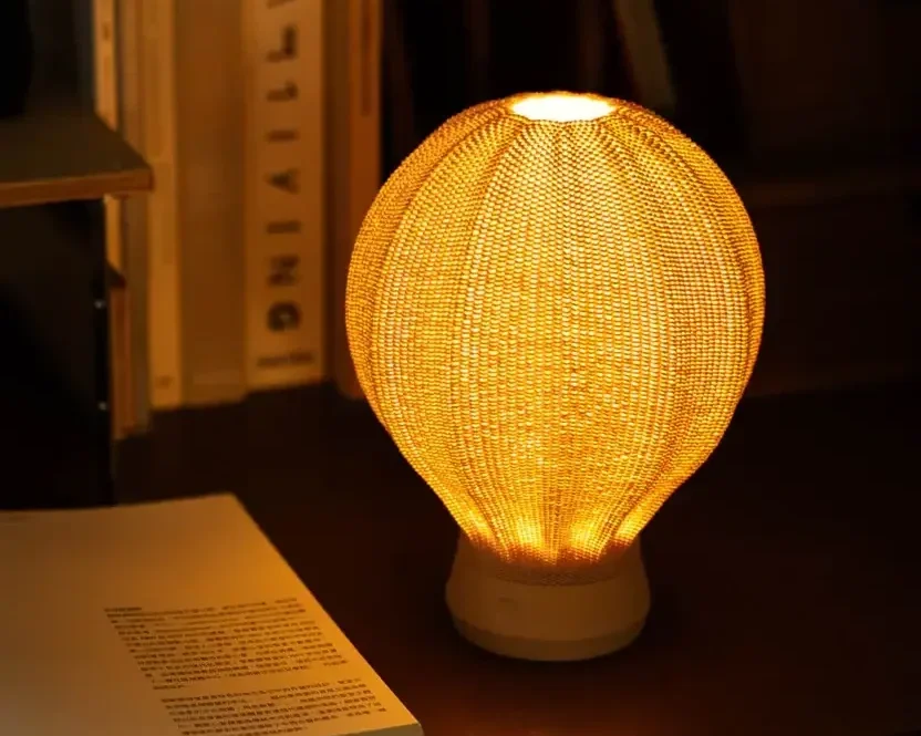 Inspired by the rounded silhouette of a floating balloon, each piece appears lightly filled with air, suspended between motion and stillness. The wood-filled material introduces subtle grain-like particles that diffuse light warmly, reminiscent of a sunset sky.